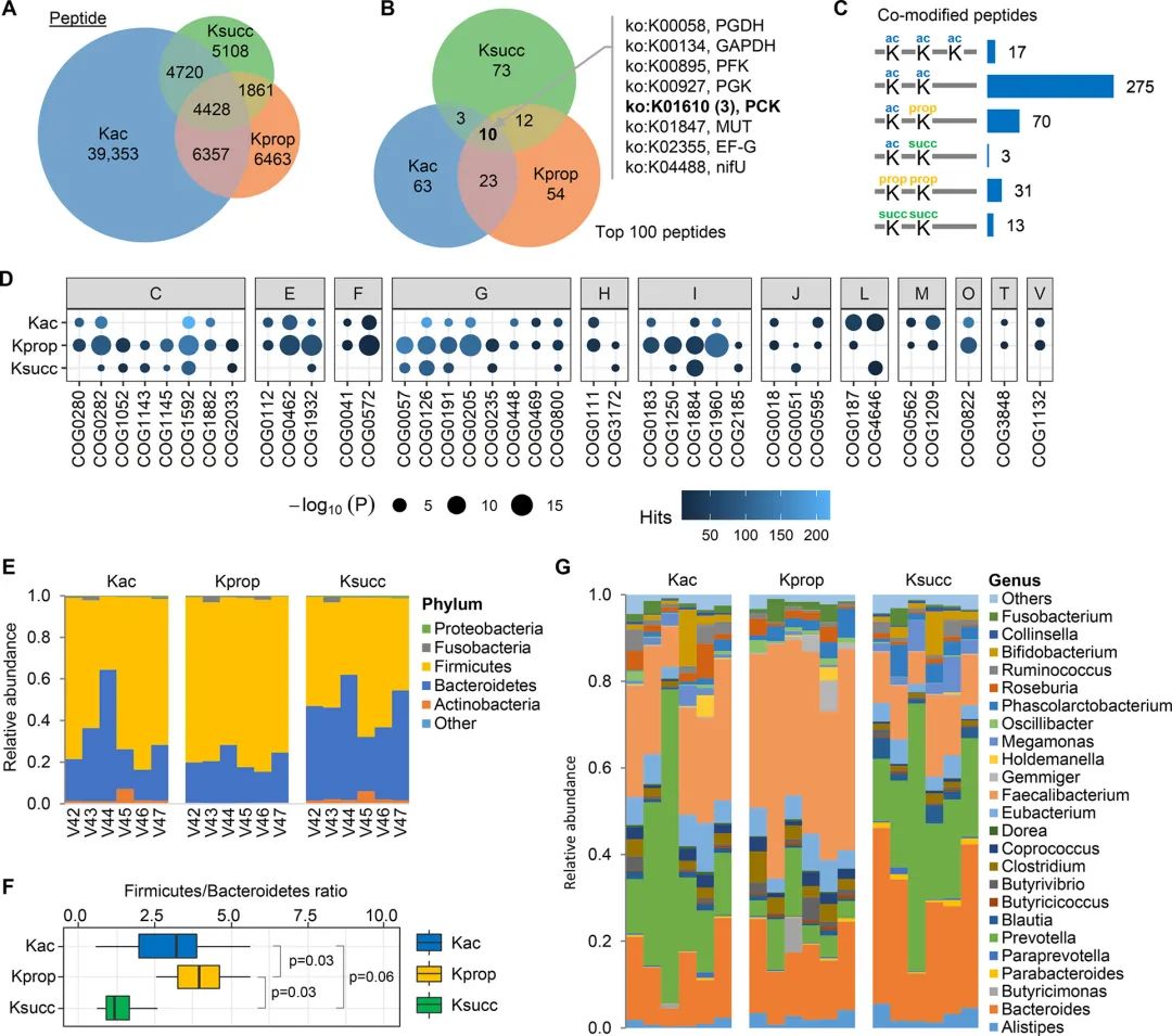 进一步生信分析揭示了人类肠道菌群赖氨酸酰化蛋白的分类特征,揭示了人类肠道菌群中不同赖氨酸酰化类型的特异性分布特征。对所有已鉴定的Kac、Kprop或Ksucc肽进行的分类分析(Taxonomic analyses )显示,在肠道菌群中大多数赖氨酸酰化肽来自厚壁菌和拟杆菌。且Ksucc更特异性分布在拟杆菌中(相比厚壁菌而言),物种间分布特异性比Kac和Kprop肽更显著(图2 E和F)。属级成分分析(Genus-level composition analyses)表明,拟杆菌属的两个属Bacteroides和Prevotella是琥珀酰化Ksucc宏修饰组层面的优势属。Ksucc宏修饰组中厚壁菌属Faeccalibacter的比重明显低于Kprop-和Kac修饰组。说明人类肠道中的琥珀酸产生菌广泛分布在类杆菌门中(图2G)。