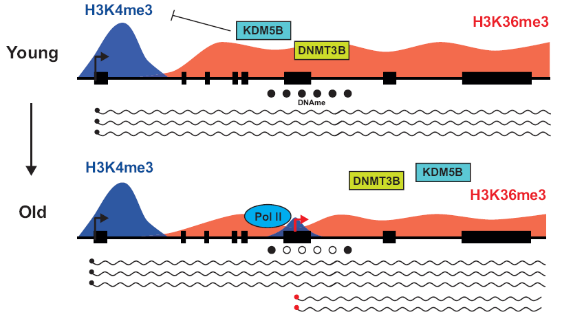 随后,通过对比年轻与年老细胞在全基因组DNA甲基化 (5mC) 和DNA 5-羟甲基胞嘧啶甲基化 (5hmC) 方面的差异发现,隐秘转录起始区域整体DNA甲基化水平下降,但去甲基化过程中间产物5hmC并未降低,且平均含量高于其他基因组区域。由于整体DNA甲基化水平是由DNA甲基化(de novo DNA methylation)和去甲基化(demethylation) 双向调控,该区域的整体DNA甲基化水平下降是由减弱的DNA甲基化而非增强的DNA去甲基化所导致。而招募DNA甲基化酶的信号正是基因中部特异性的组蛋白共价修饰H3K36me3。