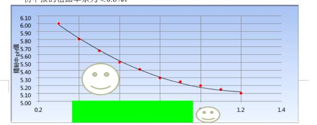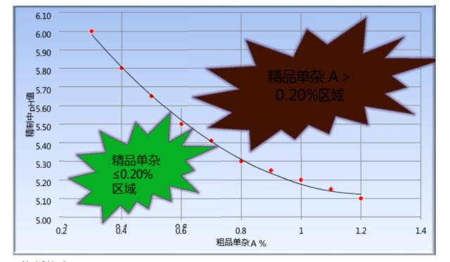 某个最终产品单杂A的质量标准为≤0.20%,来源于粗品中单杂 A,但在精制过程中可以去除一部分,主要起作用的是pH值, pH值越低,去除的能力越强,但产品收率越低,如下表所示: