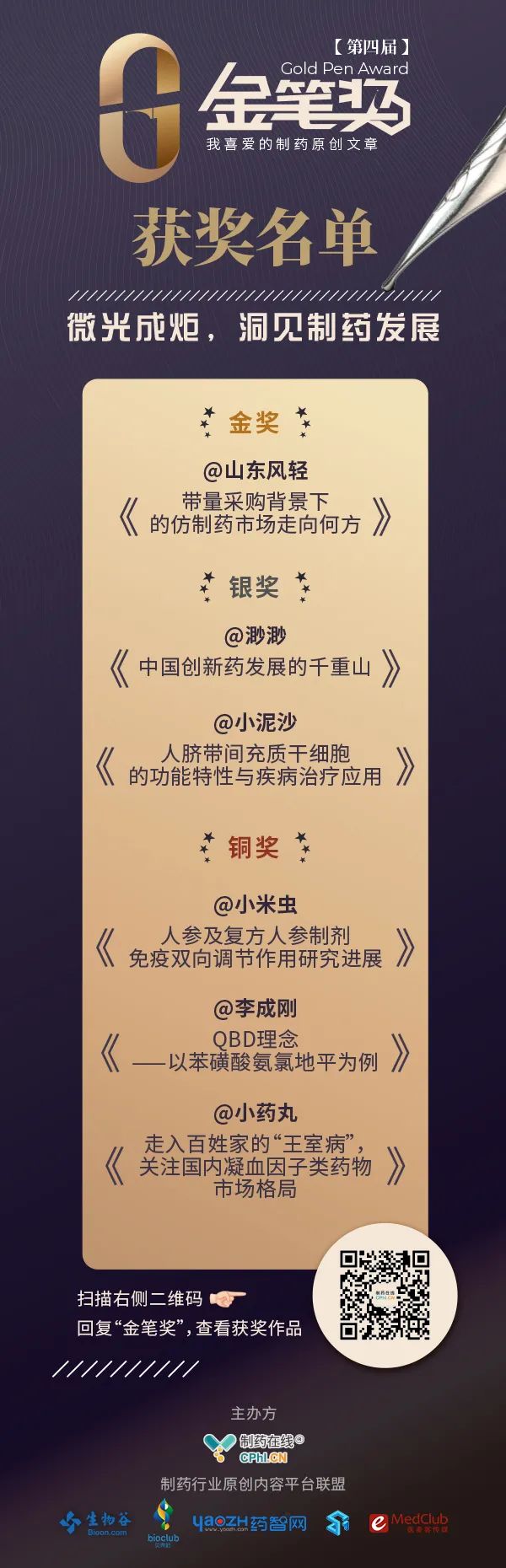 也感谢所有参与金笔奖征文活动的撰稿人以及更多在制药行业各个内容平台笔耕不辍、热忱分享的写手们!是他们让制药行业信息更透明更多元、让思考的火花更灿烂更炙热。欢迎越来越多专业人士加入内容创作者的行列!