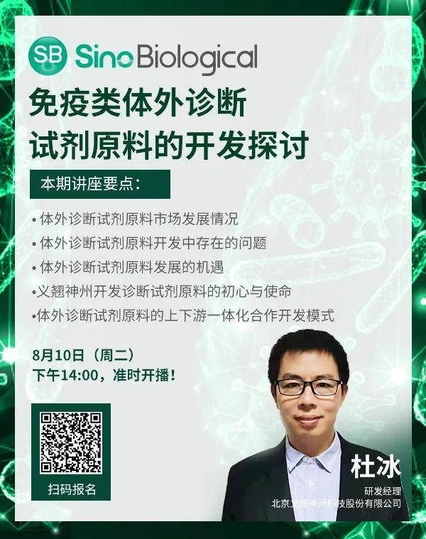那么,免疫类体外诊断试剂的原料市场的最新发展状况如何呢?在开发过程中存在哪些问题呢?挑战与机遇并存,体外诊断试剂原料的发展方向在哪里呢?为此,我们邀请义翘神州具有十多年诊断试剂原料研发经验的杜冰经理举办了一场在线讲座,将会对这些问题展开讨论。