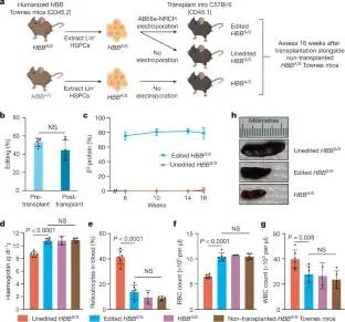 在另一组实验中,这些作者从携带人SCD HBB变体的小鼠身上提取造血干细胞,对它们进行碱基编辑,并将碱基编辑后的造血干细胞移植到另一组受体小鼠身上。移植了未经碱基编辑的造血干细胞的对照组小鼠显示出典型的症状:镰状红细胞,红血球寿命短的后果,以及脾脏肿大。相反,与对照组相比,移植了碱基编辑过的造血干细胞的小鼠在每个测试的疾病指标上都有所改善,观察到的所有测量的血液参数与健康小鼠几乎没有区别。