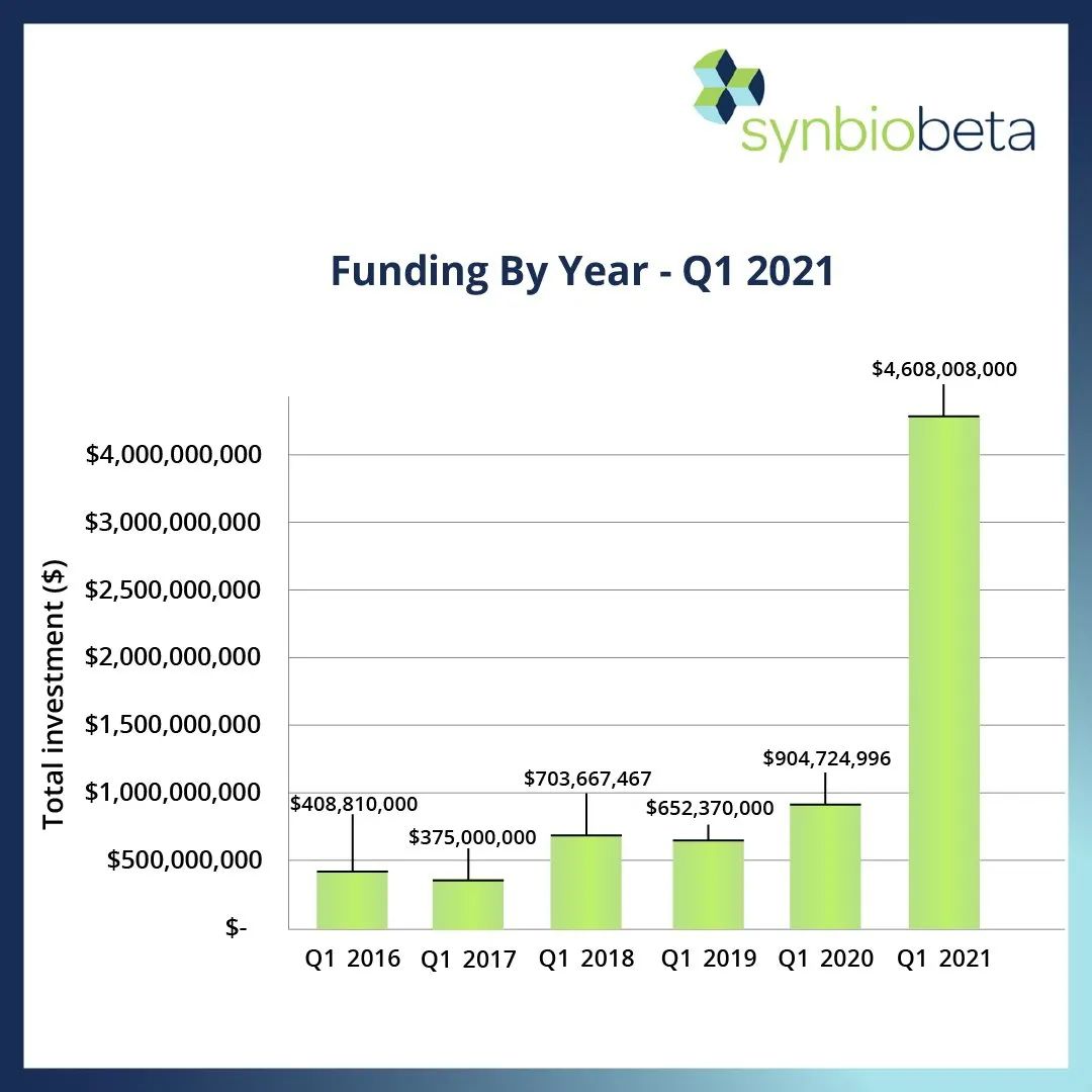 图丨 2016 年到 2021 年 Q1 合成生物学投资金额(来源:SynbioBeta)