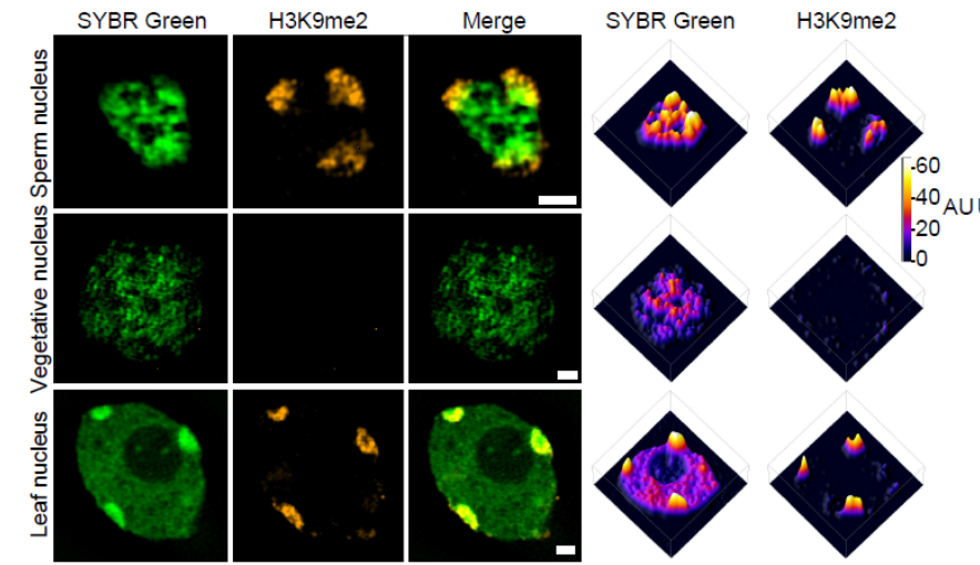 辨率显微技术(3D structured illumination microscopy,3D-SIM)观察拟南芥精子染色质结构,发现精子的异染色质和体细胞异染色质相比,表现出一定程度的去浓缩,但总体上仍形成核斑点结构,表明仍然处于较为浓缩的状态;然而,精子的常染色质区有别于体细胞和花粉营养核,表现为显著的核内不均匀分布和浓缩(Fig. 1)。