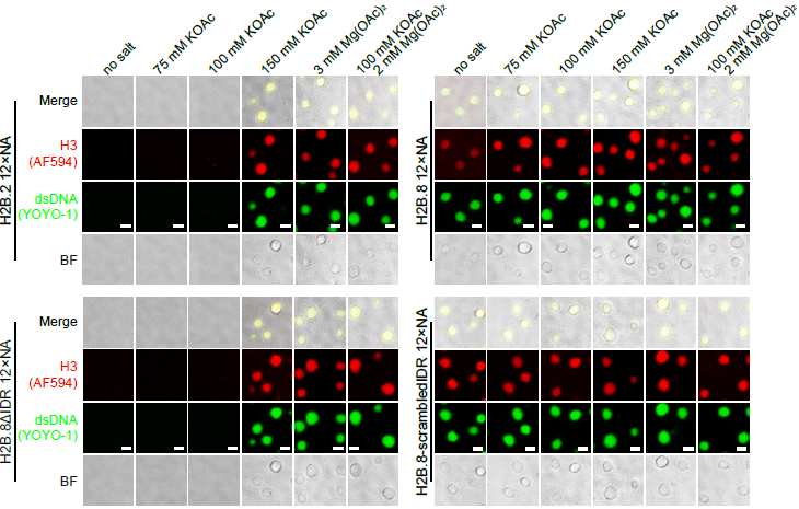 。随后作者利用体外组装核小体实验,证明H2B.8可以介导核小体的体外相分离,且该过程不依赖于阳离子的参与,这与Canonical组蛋白形成的核小体性质迥异。表明了H2B.8具有较强和特异的相分离特性。