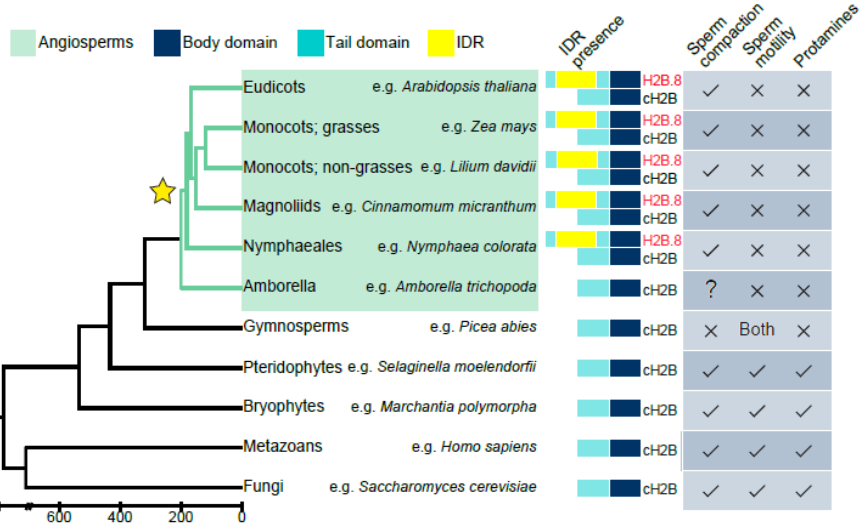 。有意思的是,尽管H2B.8-IDR的氨基酸序列在开花植物中并不保守,但它们均是无序的,暗示IDR的无序性而不是氨基酸保守性对其功能是重要的。此外,系统进化分析也暗示H2B.8是开花植物在进化过程中的创新,取代精蛋白实现对精子染色质浓缩的同时,维持其转录活性