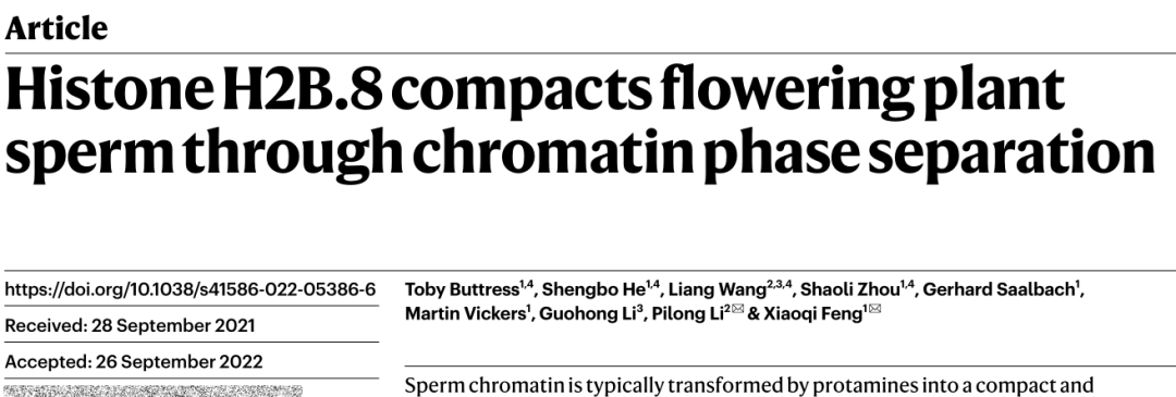 发现了一种在开花植物精细胞中特异性表达的组蛋白H2B变体H2B.8,它可以特异性得结合到常染色质转座子和基因间区域上,通过相分离凝缩精细胞中不转录的区域,进而在不影响基因表达的情况下达到浓缩精细胞染色质的目的。