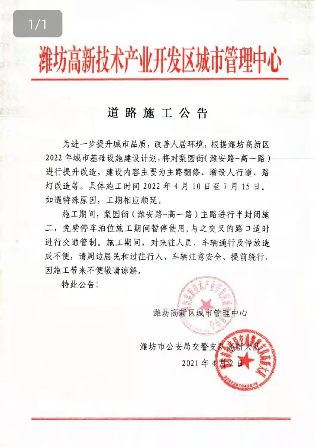 施工期间,梨园街(潍安路-高一路)主路进行半封闭施工,免费停车泊位施工期间暂停使用,与之交叉的路口适时进行交通管制。施工期间,对来往人员、车辆通行及停放造成不便,请周边居民和过往行人、车辆注意安全、提前绕行,因施工带来不便敬请谅解。