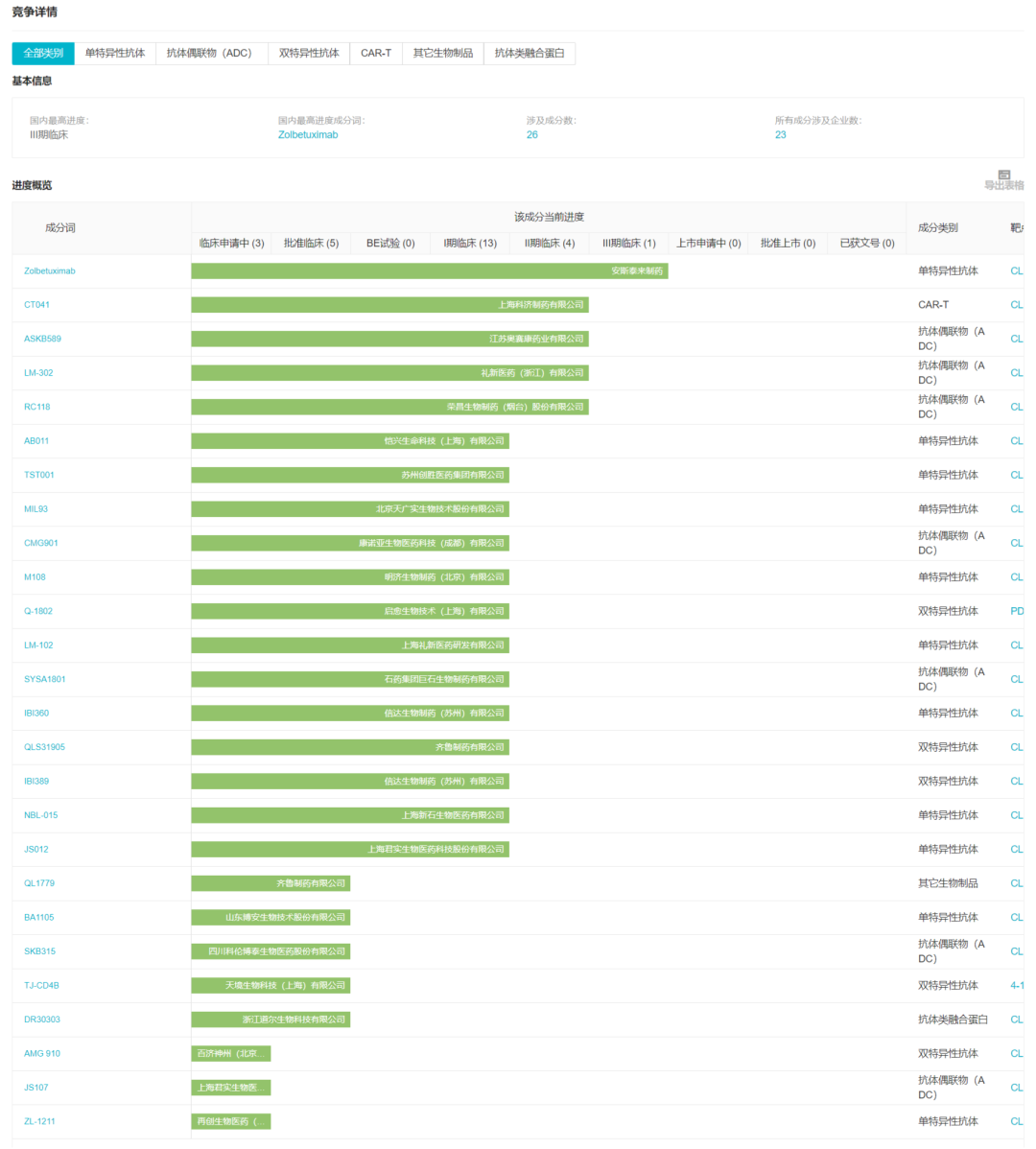 信达在多个靶点上都进行了深度布局,同时开发不止一款产品,从单抗、双抗、ADC、细胞疗法等角度全面挖掘靶点潜力,在这些靶点上通过组合产品形成协同互补。从 Claudin18.2 而言,Insight 数据库 显示,在 2021 年的 8 月和 12 月,信达已经将单抗 IBI360 和双抗 IBI389(CD3/CLDN-18.2)推进到 I 期临床阶段,本次启动 I 期临床的 CAR-T 疗法 IBI345 是第 3 款。