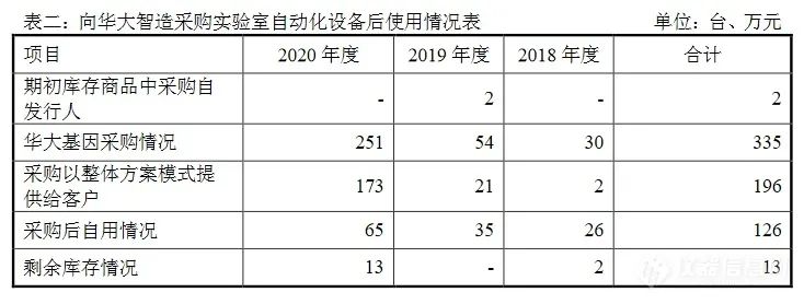 华大基因公司从华大智造采购的测序仪、实验室自动化设备在2018 年至2019 年以自用为主。2020 年,新冠疫情中公司为客户提供新冠核酸检测整体解决方案,由此加大采购自动化样本处理系统提供给客户。