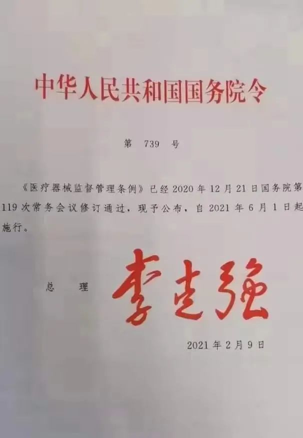 图片显示,根据中华人民共和国国务院令(第739号),《医疗器械监督管理条例(2021版)》自2021年6月1日起正式施行,并有望于近日正式对外公布细则。