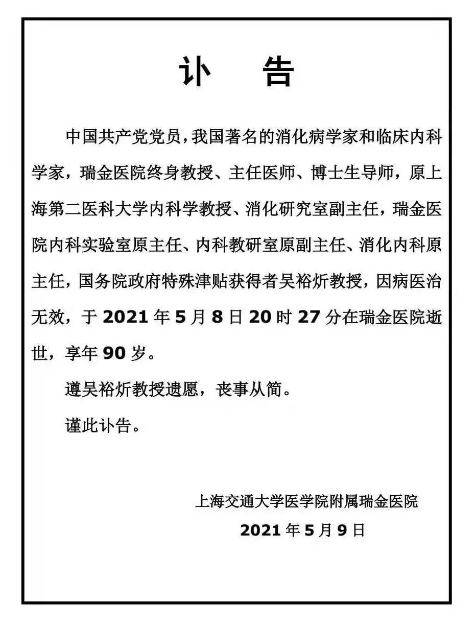 上海交通大学医学院附属瑞金医院9日发布讣告,该院终身教授、消化内科原主任吴裕炘逝世,享年90岁。