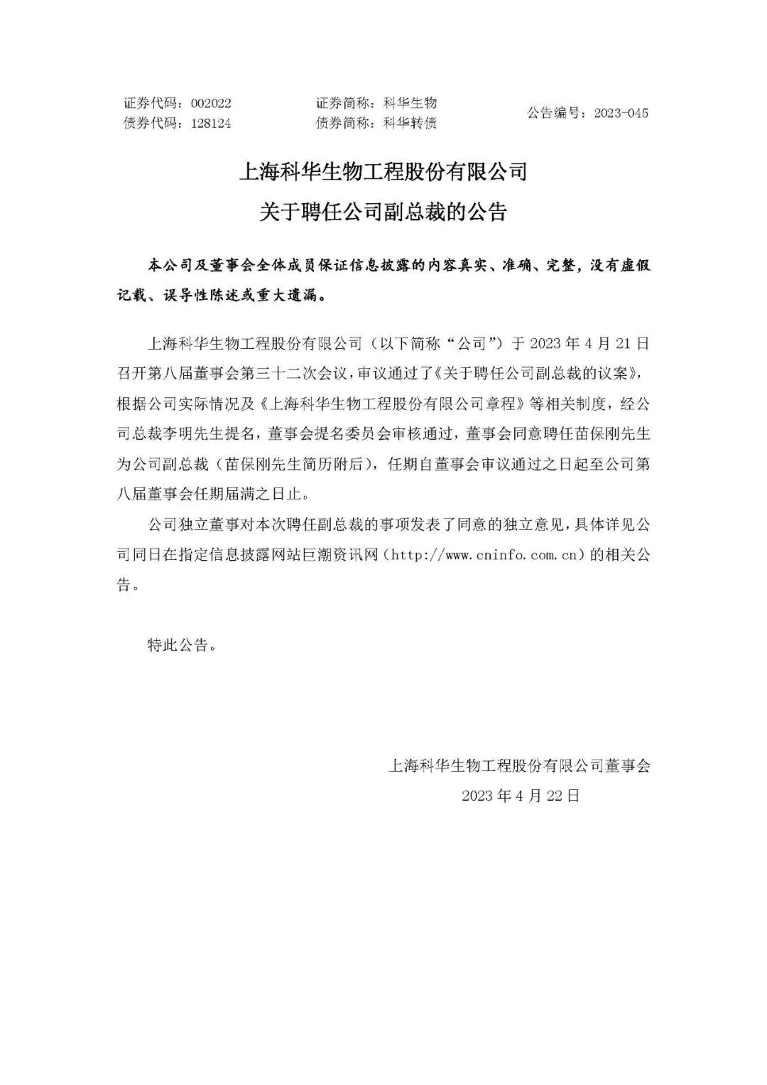 科华生物4月21日公告,经公司总裁李明提名,董事会提名委员会审核通过,董事会同意聘任苗保刚为公司副总裁。(至此,科华高管团队中,已经有李明、苗保刚两位天隆公司核心人员)