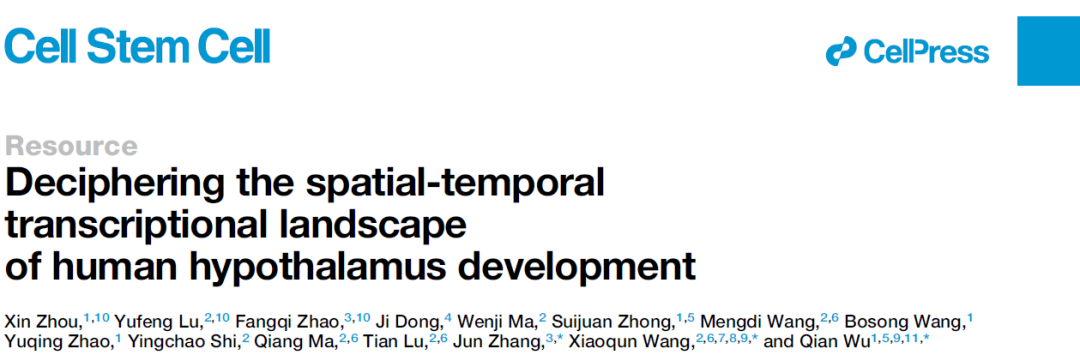 2021年12月7日,北京师范大学吴倩课题组、中科院生物物理研究所王晓群课题组,携手首都医科大学附属安贞医院张军课题组在Cell Stem Cell杂志在线发表了题为 Deciphering the spatial-temporal transcriptional landscape of human hypothalamus development 的文章。研究团队系统深入的揭示了人类下丘脑在胚胎发育的早期和中期单细胞转录组的时空动态变化、细胞类型特点和不同细胞谱系发育轨迹的时空特征,为深入了解其空间和功能复杂性奠定重要基础。