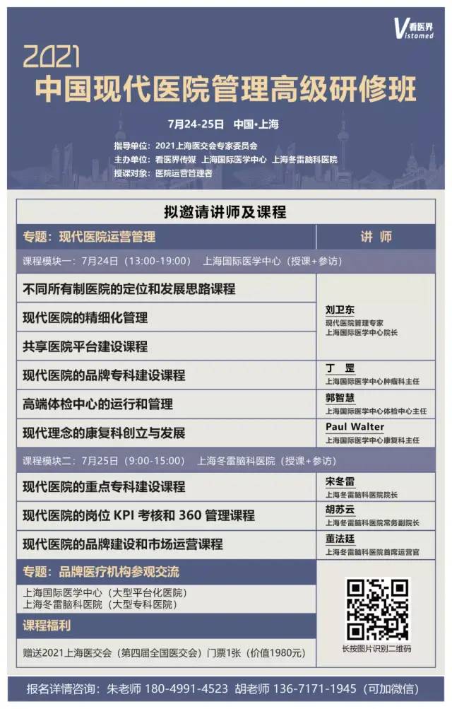 7月24-25日,《看医界》传媒联合上海国际医学中心和上海冬雷脑科医院重磅推出“2021中国现代医院管理高级研修班”邀请现代医院管理专家、平台型医院建设专家、上海市国际医学中心院长刘卫东教授;上海国际医学中心肿瘤科主任、丁罡肿瘤医生集团创始人丁罡教授;上海国际医学中心体检中心主任郭智慧及康复科主任Paul Walter ;上海冬雷脑科医院院长、创始人宋冬雷教授;上海冬雷脑科医院首席运营官董法廷及常务副院长胡苏云亲自授课+互动交流。