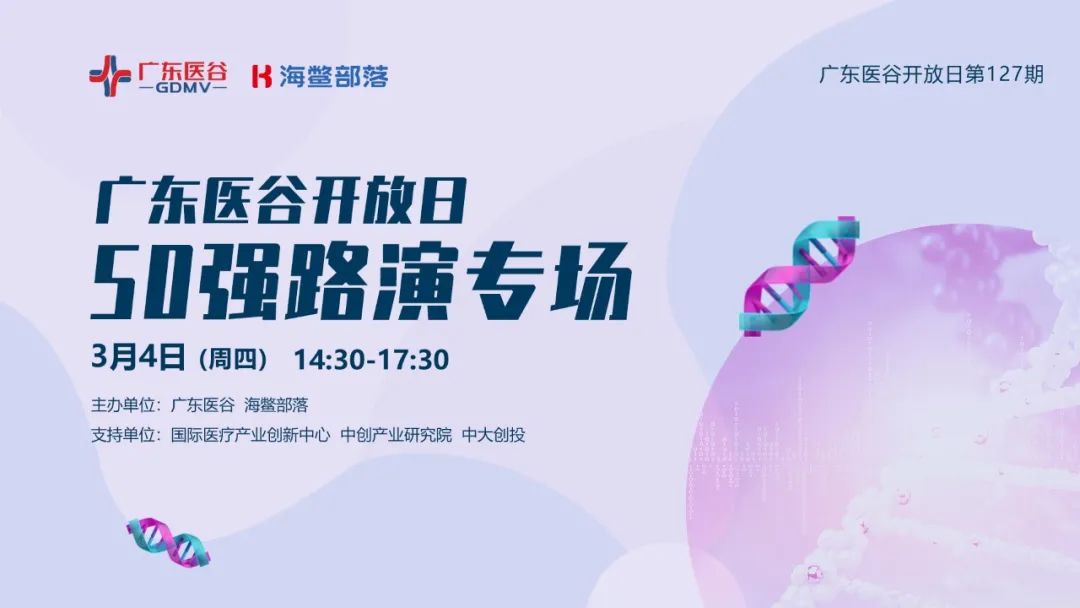 3月4日,127期广东医谷开放日-50强项目路演专场活动将于广州银行大厦7楼国际路演厅举行。此次路演专场,是“第三届粤港澳大湾区生物科技创新企业50强评选”50强上榜企业的专场路演对接活动,欢迎莅临现场交流对接!