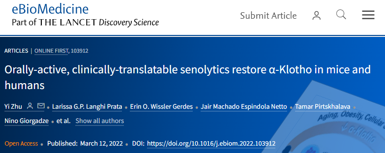 [1] Yi Zhu, et al., (2022). Orally-active, clinically-translatable senolytics restore α-Klotho in mice and humans. eBioMedicine, DOI: https://doi.org/10.1016/j.ebiom.2022.103912