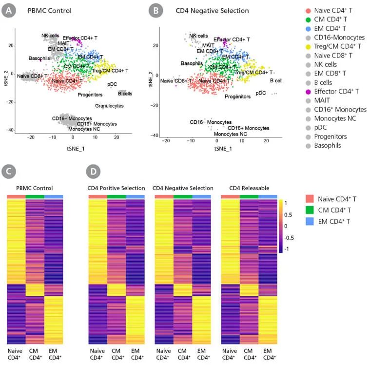 对(A)PBMC对照样本和(B)EasySep™人CD4+ T细胞富集试剂盒(产品号 #19052)分离的细胞测序后 进行tSNE聚类分析。CD4+ T细胞聚类的颜色如图所示。从发表的CD4+ T细胞特定标记物的列表(Zhang et al., 2018)中选择500个基因。绘制(C)PBMC对照样本和(D)使用EasySep™人CD4正选试剂盒II(产品 号 #17852)、EasySep™人CD4+ T细胞富集试剂盒(产品号 #19052)和EasySep™ Release人CD4正选试剂盒(产品号 #17752)分离的细胞的CD4+细胞基因表达热图。计算每个样本中Seurat鉴定的三个CD4+ T细胞(Naïve、中央记忆和效应子记忆CD4+ T细胞)聚类的平均表达。
