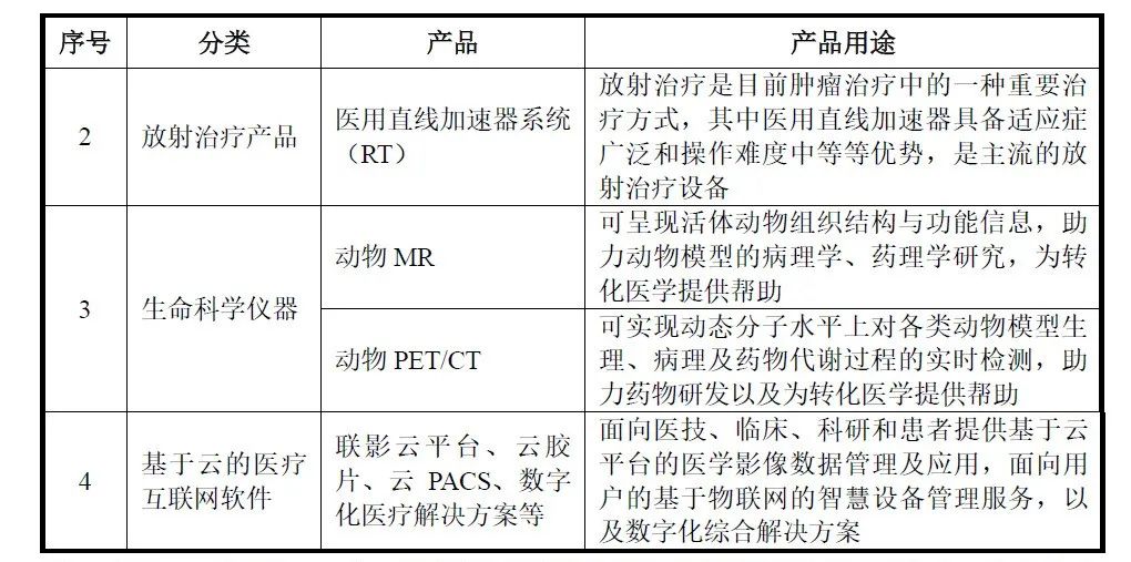 截至报告期末,公司累计推出80余款产品,包括磁共振成像系统、X射线计算机断层扫描系统、X射线成像系统、分子影像系统(PET/CT、PET/MR)、医用直线加速器系统以及生命科学仪器。