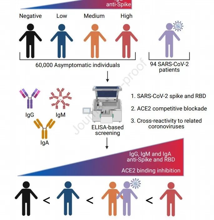 研究者对无症状感染者的抗体应答水平进行分类,发现恢复期患者与中度无症状感染者的抗体应答最相似,轻度应答无症状患者患者主要以抗S蛋白、RBD IgG为主;而在高度应答组各类抗体亚型均普遍存在。在高度、中度应答组对其他冠状病毒的IgG应答水平都明显较高。研究者进一步分析了抗S蛋白、RBD抗体与ACE2结合抑制的相关性,结果表明两者间存在明显相关性,可以通过特异性IgG水平预测ACE2结合抑制能力。