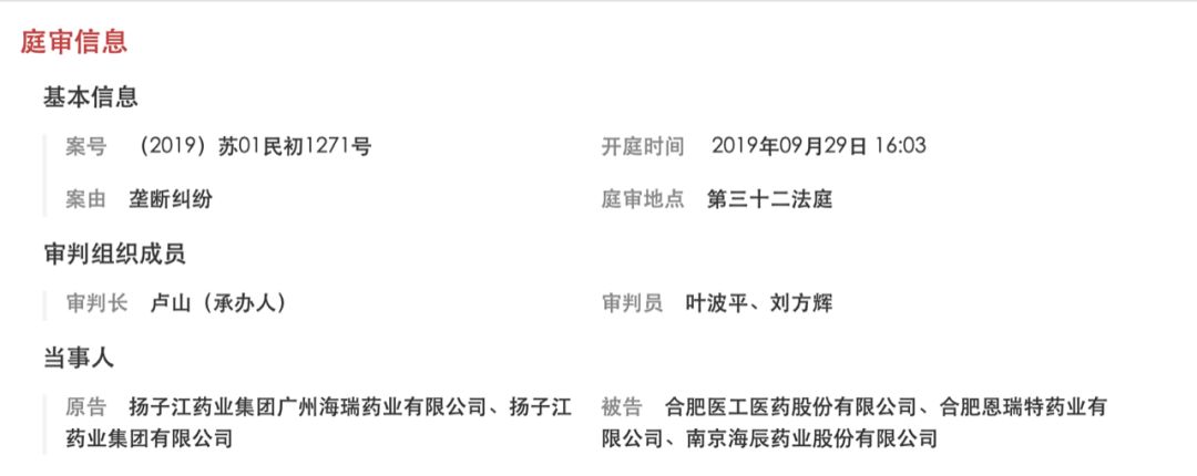 于是在2019年9月29日16:03,南京市中级人民法院就扬子江药业集团广州海瑞药业有限公司、扬子江药业集团有限公司诉合肥医工医药股份有限公司、合肥恩瑞特药业有限公司、南京海辰药业股份有限公司垄断纠纷一案进行公开审理。