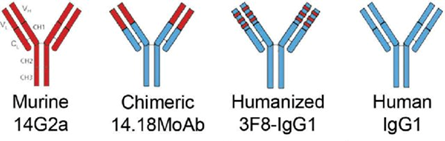目前已获批治疗神经母细胞瘤的GD2单抗主要源于两种抗体:Ch14.18(以及更早的鼠源版本14G2a)和3F8。其中Ch14.18衍生出两种单抗药物:达妥昔单抗和达妥昔单抗β,于2015年和2017年分别在美国和欧盟被批准上市。由3F8衍生的那西妥单抗2020年被FDA加速批准上市。达妥昔单抗类属于人-鼠嵌合抗体(“ch”代表“嵌合”,Ch14.18的抗体可变区来自鼠源的IgG3抗体,恒定区来自于人源的IgG1抗体),而那西妥单抗则是由移植技术改造的人源抗体,大幅降低异源免疫应答产生的风险(见图2)。