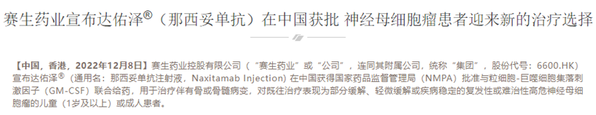 2022年12月8日,赛生药业发布公告,宣布达佑泽®(那西妥单抗注射液)获得国家药品监督管理局(NMPA)批准,与粒细胞-巨噬细胞集落刺激因子(GM-CSF)联合给药,用于治疗复发性或难治性高危神经母细胞瘤的儿童(1岁及以上)或成人患者。这是继达妥昔单抗β之后,在我国获批的第二款GD2单抗,为神经母细胞瘤的患者带来了更多治疗选择。