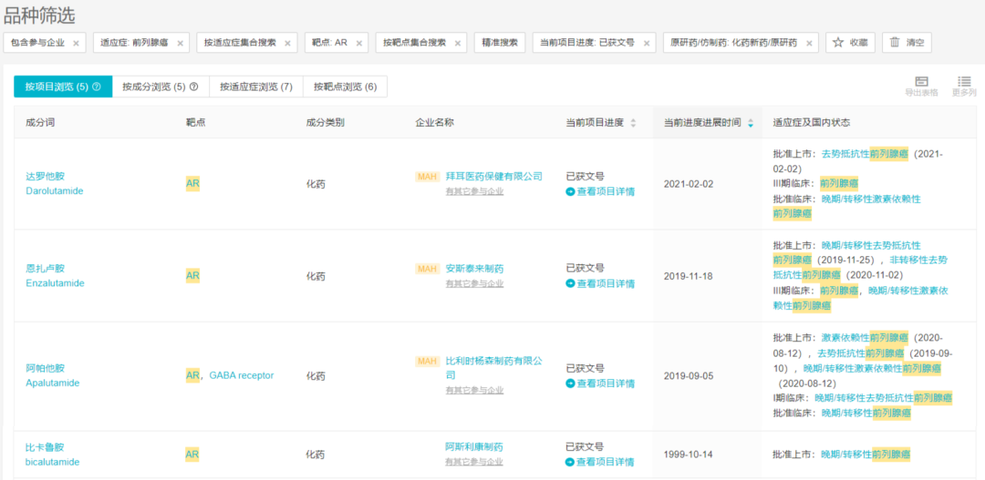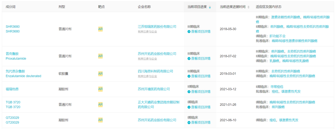 Insight 数据库显示,目前全球范围内已有 6 款 AR 抑制剂获批上市,其中 4 款在国内已经上市,分别是杨森制药的阿帕他胺、阿斯利康的比卡鲁胺、拜耳的达罗他胺以及安斯泰来的恩扎卢胺,除一代的比卡鲁胺外,其余均为二代 AR 拮抗剂。