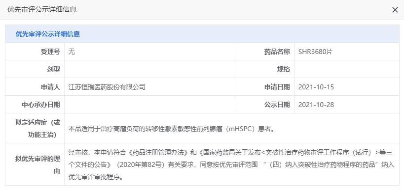 刚刚,CDE 官网显示,恒瑞二代 AR 拮抗剂 SHR3680 已经申报上市,拟纳入优先审评审批,用于高瘤负荷的转移性激素敏感性前列腺癌(mHSPC)患者。