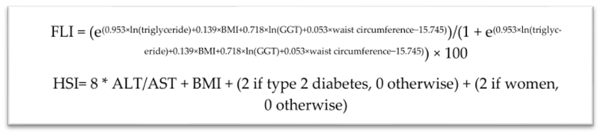 FLI和HSI的计算是基于对BMI、腰围、血清甘油三酯、GGT、AST/ALT、2型糖尿病程度和性别等因素的分析。将FLI≥60或HSI≥36的定义为NAFLD。