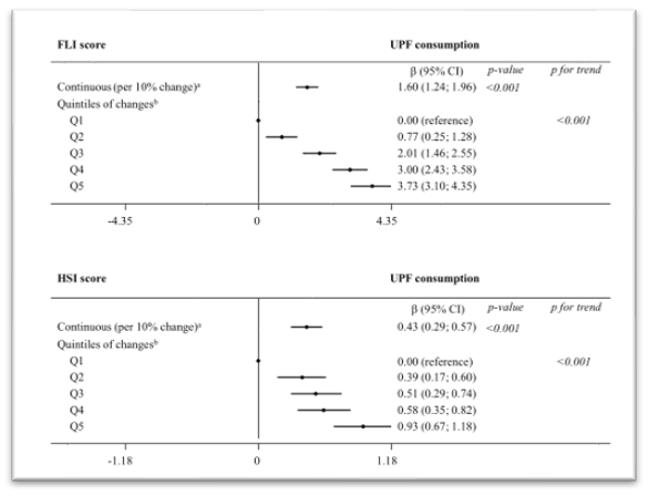 实验开始时,根据UPF的消耗量的多少将参与者分为5组。与UPF消耗最低组(Q1)相比,消耗最高组(Q5)参与者的年龄更小,生活方式不健康,久坐时间、能量摄入、饱和/反式脂肪酸、胆固醇、糖摄入、BMI、腰围都较高,纤维素和酒精的摄入较低,对地中海饮食的坚持度较差。另外,Q5组的ALT/AST、甘油三酯、NAFLD指标(FLI和HSI)都表现出更高的水平。