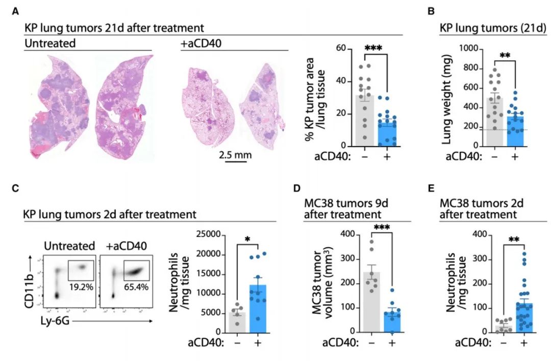 为了了解中性粒细胞在癌症中的确切作用,研究团队在患有肺癌或结直肠癌的荷瘤小鼠中进行了癌症免疫治疗,并观察了中性粒细胞的变化。结果发现,在对治疗反应良好的荷瘤小鼠中,中性粒细胞的数量显著增加。