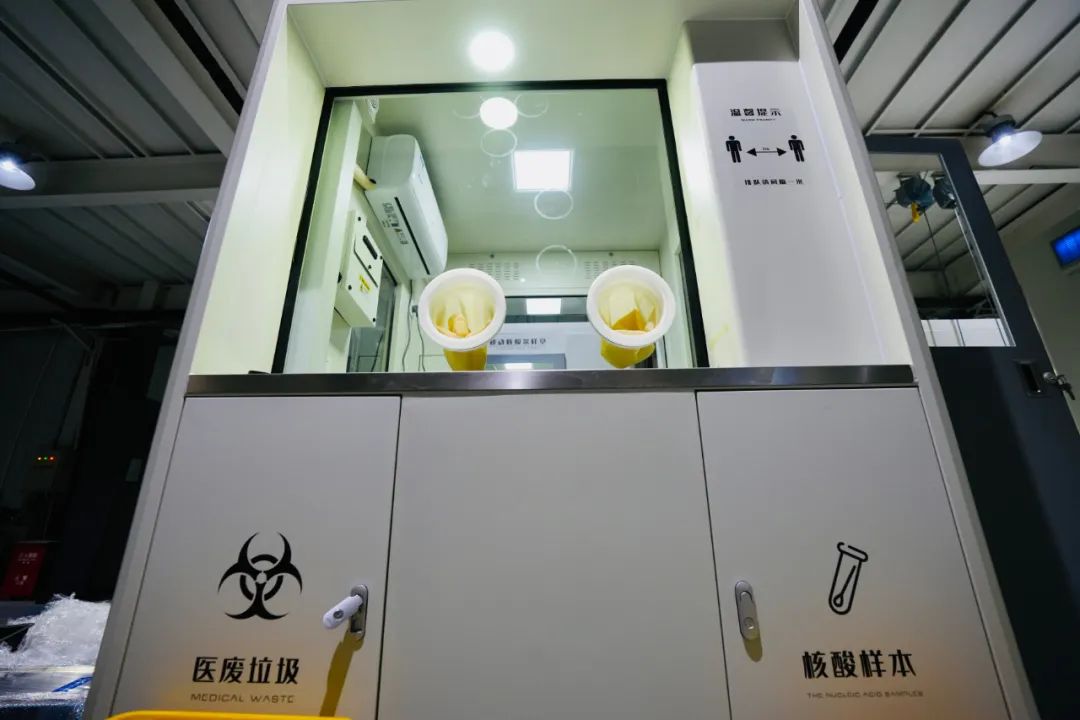 这一智能核酸检测亭采样区包括自动感应杀菌装置、医废垃圾投递口、医用棉签暂存口、采样试管暂存口、样本试管暂存口、采样试管取出口、采样试管扫码口、双目人脸识别显示屏、IC卡刷卡处,智能采样系统,人证匹配,确保试管样本的有序标记及被采集人的唯一性。