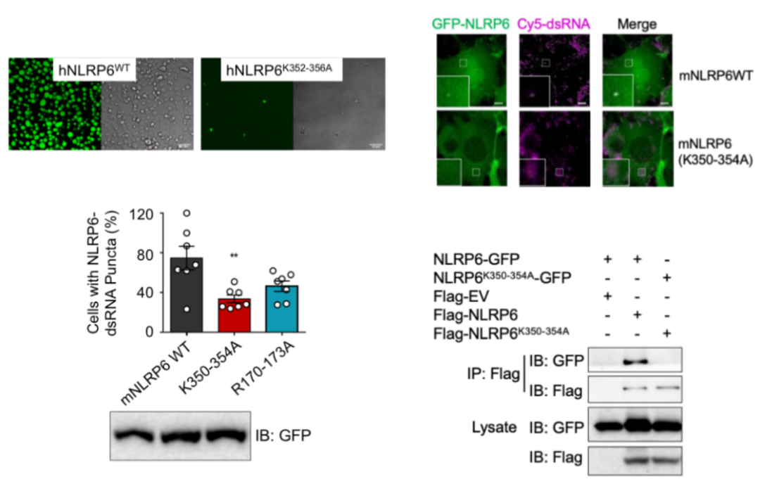 那么dsRNA与NLRP6是如何形成液液相分离的呢?研究人员通过光控(Opto-genetics)等实验发现NLRP6蛋白序列中含有内在无序区(IDR),在对IDR序列进行比对的过程中发现高频的带正电荷氨基酸——赖氨酸在不同物种中具有高度保守性,这提示着该区域对于液液相分离的形成具有特殊的意义。多价相互作用已经被证明在液液相分离中起到关键作用,核酸与蛋白质形成的静电相互作用导致多价相互作用的形成也有许多研究报道【1,2】。因此研究人员猜测NLRP6 IDR区域的多个赖氨酸重复介导的多价相互作用介导了LLPS的形成。的确,体外表达纯化突变体以及细胞内外源表达突变体等实验表明多个赖氨酸是dsRNA与NLRP6液液相分离的重要结构(图二)。
