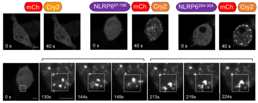 为了探究赖氨酸对液液相分离的影响,研究人员构建了赖氨酸突变体,通过体外表达纯化蛋白及一系列的细胞实验发现,突变体的确抑制了NLRP6的液液相分离,通过光控实验发现其多价相互作用较野生型小,且会影响NLRP6的自我聚集。同时功能试验表明,细胞外源表达突变体较野生型而言明显抑制NLRP6炎症小体的激活——细胞焦亡的产生,以上证据表明,多个赖氨酸区域是启动NLRP6液液相分离以及后续炎症小体激活的关键,多价相互作用是NLRP6液液相分离的关键作用力(图三)。