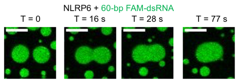 随后研究人员发现dsRNA与NLRP6在体外以及细胞中都可以形成液滴聚集体,研究人员通过荧光漂白恢复实验以及凝聚体融合等实验证明了dsRNA与NLRP6的确通过液液相分离形成凝聚体(图一)。