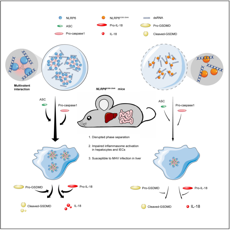 2021年10月21日,哈佛大学医学院吴皓课题组联合中国科学技术大学朱书课题组在Cell发表题为Phase Separation Drives RNA Virus-Induced Activation of the NLRP6 Inflammasome 的研究论文,发现了dsRNA可以诱导NLRP6发生相分离进而激活炎症小体抗病毒免疫反应。