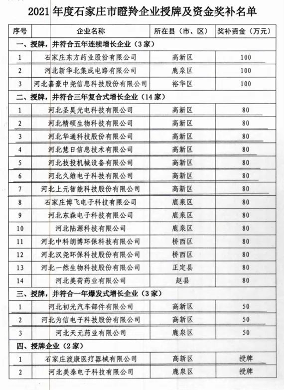 近日,石家庄市委、市政府公布了22家获得市级瞪羚企业称号的企业名单,我区11家企业喜获授牌,占全市50%,其中10家企业获奖补资金760万元。