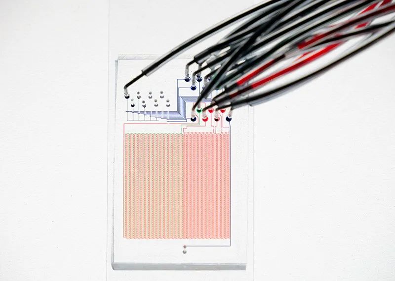 硅微流控芯片有1568个反应室阵列。蚀刻在芯片上的通道将腔室连接到连接到顶部的控制管道
