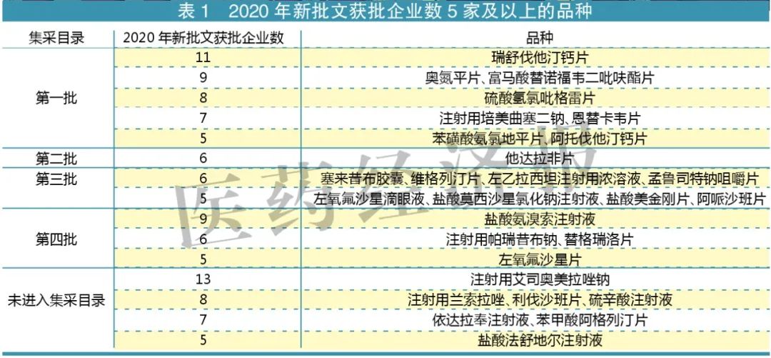 瑞舒伐他汀钙片共有11家企业申报,对应批文数18个,是2020年获得仿制药药品上市批文数最多的品种。瑞舒伐他汀钙片在2018年就已经在“4+7”集中采购目录中,2020年还有如此多的批文获批,更多还是因为企业已经投入了成本只能继续申报,或者是在集中采购的结果公布前已经申报上市了。