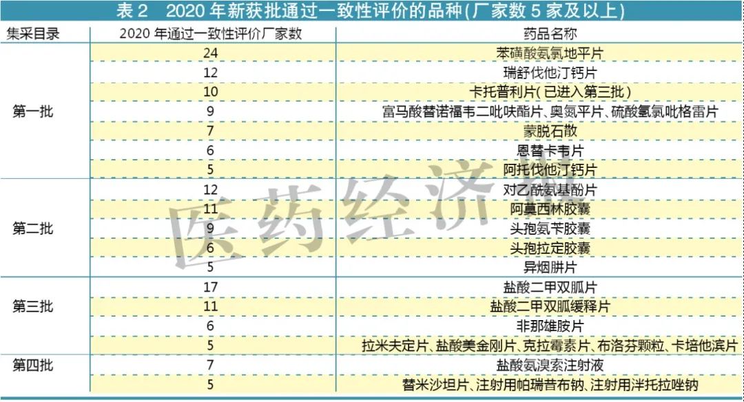 2020年新获批通过一致性评价的品种共26个,全部都在集采目录中。其中苯磺酸氨氯地平片有24家获批,为最多通过一致性评价的品种。由此可见,市场规模较大的品种原有的批文数越多,在政策引导下启动一致性评价越多,集中采购的竞争压力越大。
