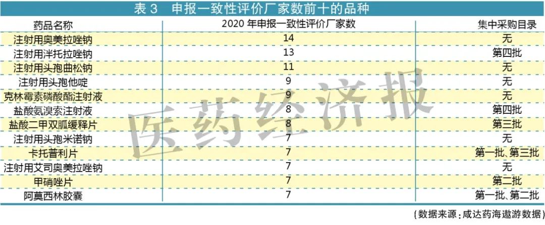 2020年申报一致性评价厂家数前十的品种(由多到少)以注射剂为主,并且是以质子泵抑制剂和抗生素为主。这十个注射剂中,已经有2个进入了2021年即将启动的第四批集中采购目录,还有6个尚未进入任何集中采购目录。不过,随着注射剂的产品通过一致性评价的数量增加,预计这6个品种非常有可能进入第五批集中采购目录。