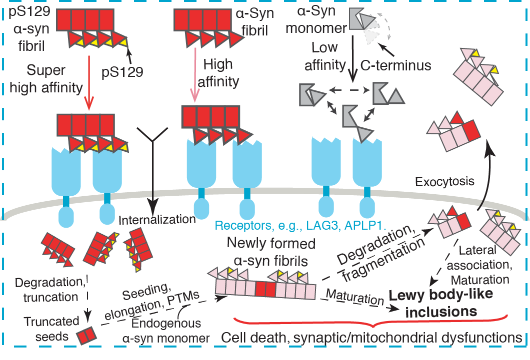 综上,本工作研究了膜受体介导的α-syn病理纤维细胞间传播的分子机制。首次发现α-syn的C末端作为α-syn病理纤维传播的关键区域,通过结合不同膜表面受体蛋白的正电口袋,介导α-syn病理纤维进入到细胞中,诱导细胞内源非聚集态的α-syn病理性聚集,并引发相应的细胞毒性和死亡等(图3)。在生理状态下,α-syn的C末端被其自身的其他区域所屏蔽而处于自锁状态;而在病理条件下,α-syn单体形成纤维,其C末端被释放并富集在α-syn纤维的表面,从而增强α-syn纤维与受体蛋白的结合。本工作阐明了受体蛋白介导的α-syn病理纤维传播的分子机制,加深了对α-syn病理纤维传播,尤其是S129位磷酸化在其中作用的理解。同时,提出α-syn与受体蛋白之间的作用界面可以作为潜在的抗PD药物筛选的靶点,为PD药物的设计和研发提供了新的思路。