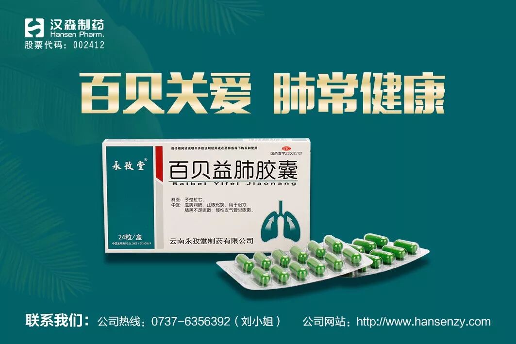 由湖南汉森制药股份有限公司旗下的全资子公司云南永孜堂制药有限公司独家生产的百贝益肺胶囊,顾名思义,就是一款疗效显著、安全可靠的专门针对肺部疾病治疗的中成药,其专用于治疗肺阴不足引起的久咳,以及支气管炎、肺痨久咳等。