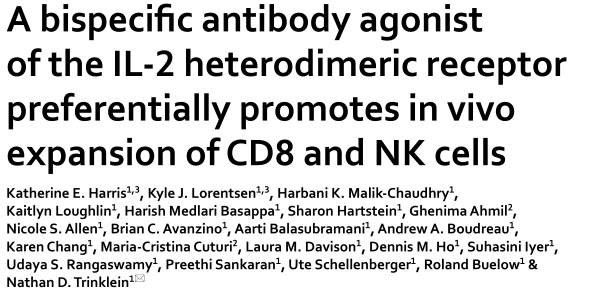 设计的IL-2Rβγ双特异性激动剂可以激活免疫效应细胞,同时避免T-regs的优先激活。虽然双特异性激动剂在T-Regs和效应细胞上与IL-2Rβγ保持了等量的结合,但与T-regs相比,更多的效应细胞被双特异性抗体激活。这与天然的IL-2相反,后者与Tregs上的IL-2Rαβγ结合的亲和力是IL-2Rβγ的100倍,从而使IL-2的活性偏向Tregs。这些分子的优越的生物活性,同时与FC介导的半衰期延长相结合提供了提高抗肿瘤疗效和并降低与rhIL-2治疗相关的剂量限制毒性的可能。