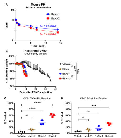 在小鼠移植人PBMC模型中,IL-2Rβγ激动剂双特异性抗体可刺激相当于或优于rhIL-2的T细胞的活化和扩增。