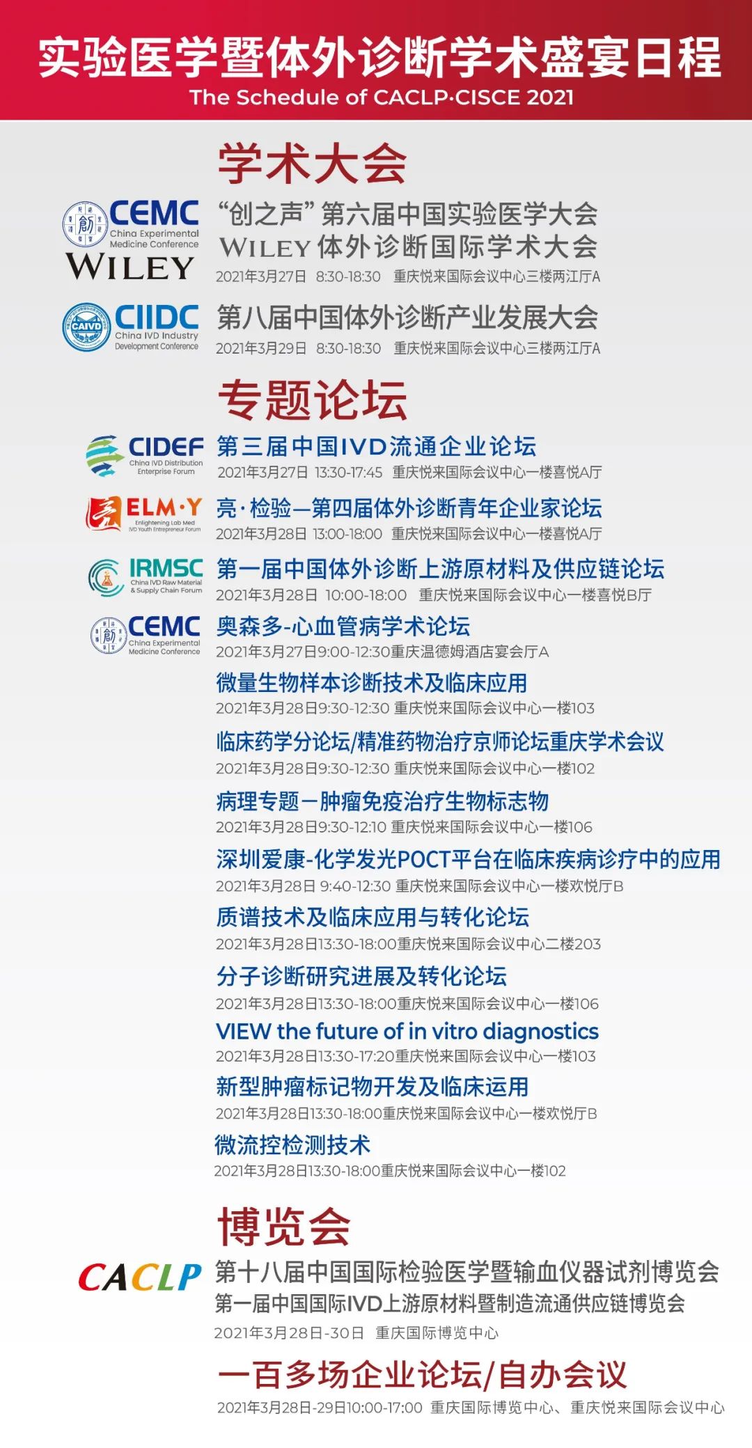 由智奥瑞和(上海)展览有限公司主办的第十八届中国国际检验医学暨输血仪器试剂博览会(简称“CACLP”)、第一届中国国际IVD上游原材料暨制造流通供应链博览会(简称“CISCE”)将于2021年3月28日-30日在重庆国际博览中心举行。