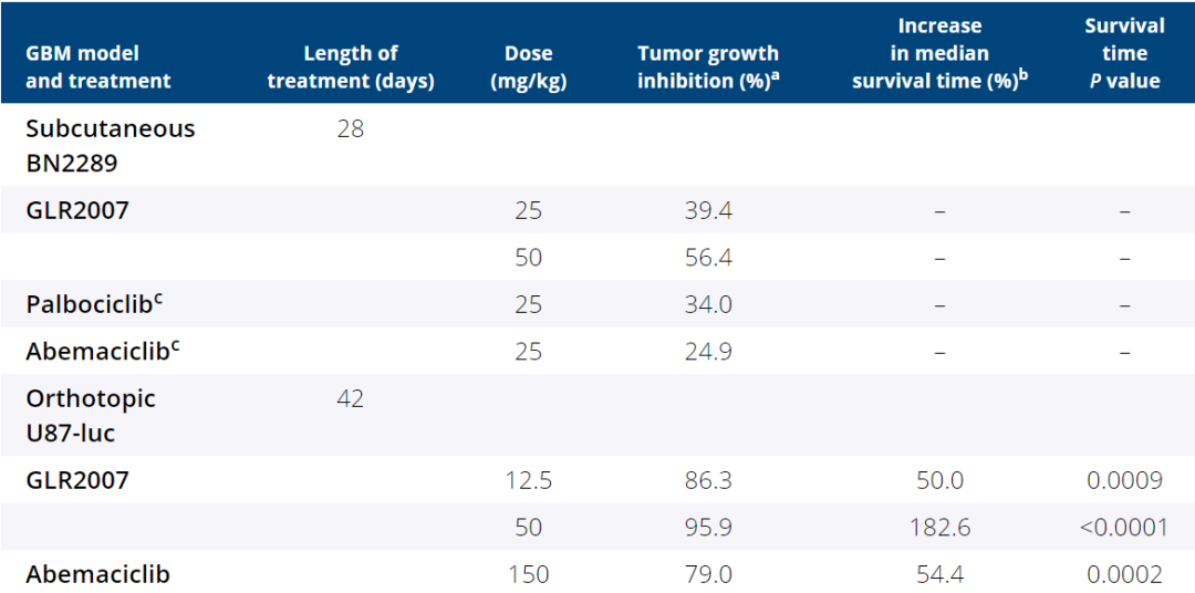 在 2021 ASCO 和 ESMO 会议上,甘李药业公布了 GLR2007 的临床前数据。体外研究结果表明, GLR2007 对 CDK4 和 CDK6 的抑制作用分别是哌柏西利的 33.1 和 3.8 倍,当浓度大于 13.72 nM 时,GLR2007 可以阻滞 U87-MG 细胞从 G1 期进展到 S 期。GLR2007 可以抑制 U87-MG (IC50 15.6±2.4 nM) 和 U118-MG (IC50 23.2±5.2 nM) 细胞的增殖。在两种小鼠 GBM 异种移植模型中观察到,GLR2007 相对于哌柏西利及阿贝西利具有更优异的抗肿瘤活性(见下表)。