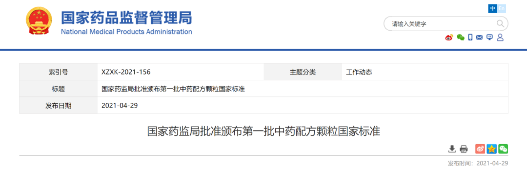 4月29日,国家药监局正式颁布了第一批中药配方颗粒国家标准(160个)。第一批中药配方颗粒国家标准颁布后,设置6个月的过渡期,将于2021年11月1日起正式实施。按照《关于结束中药配方颗粒试点工作的公告》规定,自实施之日起,省级药品监督管理部门制定的相应标准即行废止。