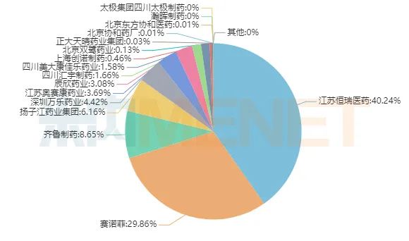 米内网数据显示,在中国城市公立医院、县级公立医院、城市社区中心以及乡镇卫生院(简称中国公立医疗机构)终端,多西他赛注射液是抗肿瘤药中的超40亿大品种,2020H1排在TOP20产品中的第四位。目前原研企业赛诺菲的市场份额仅占不到三成,而国内药企中恒瑞成为了领军企业,齐鲁紧随其后。